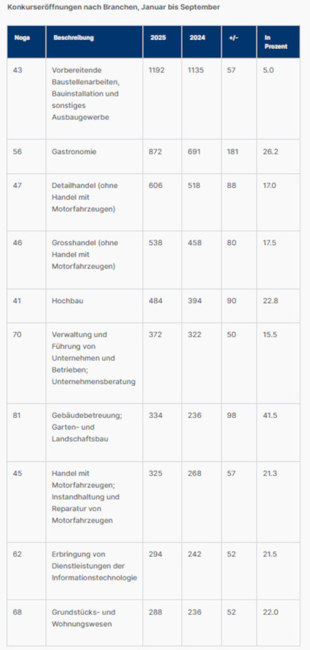 Branchenbezogen entfielen die meisten Konkurse auf das Baugewerbe (1192 Fälle), gefolgt von der Gastronomie (872) und dem Detailhandel (606). Die höchsten prozentualen Zuwächse wurden im Bereich Gebäudebetreuung, Garten- und Landschaftsbau (+41.5 %), bei sonstigen überwiegend persönlichen Dienstleistungen (+37.5%), das sind z.B. Coiffeur- oder Kosmetiksalons, und der Gastronomie (+26.2%) registriert.